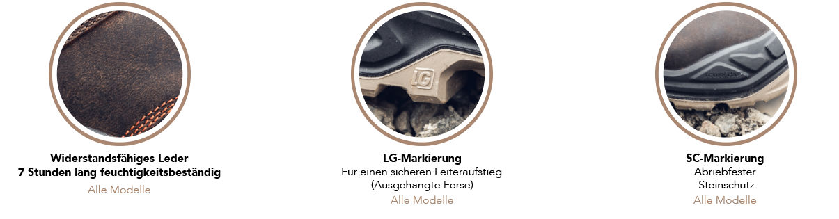 Sie sind nun mit einer Steinschlagschutz-Kappe ausgestattet und mit der Kennzeichnung SC versehen. Die Absatzkante ist mit LG (Ladder Grip) gekennzeichnet, für mehr Sicherheit auf Leitern. Diese Modelle aus Büffelleder sind bis zu 7 Stunden lang feuchtigkeitsbeständig.