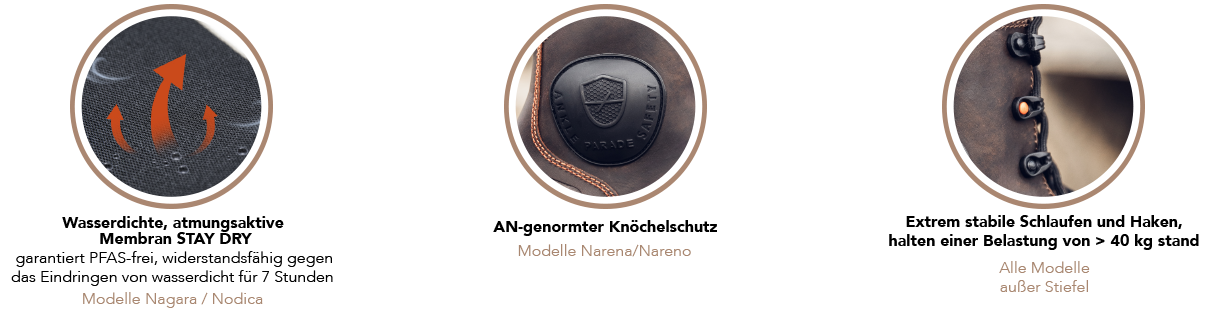 - Modelle Nagara und Nodica: wasserdichte, atmungsaktive STAY DRY Membran, die bis zu 7 Stunden lang wasserbeständig ist, fünfmal länger als die Testanforderungen, und garantiert PFAS-frei.