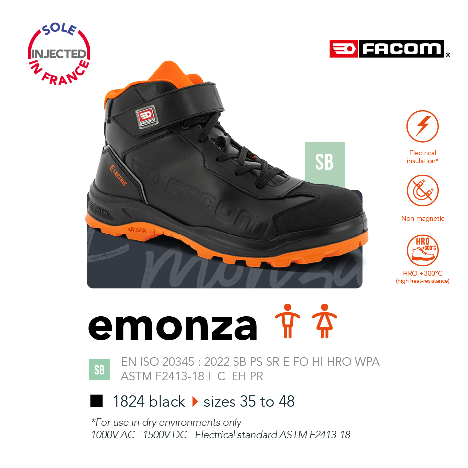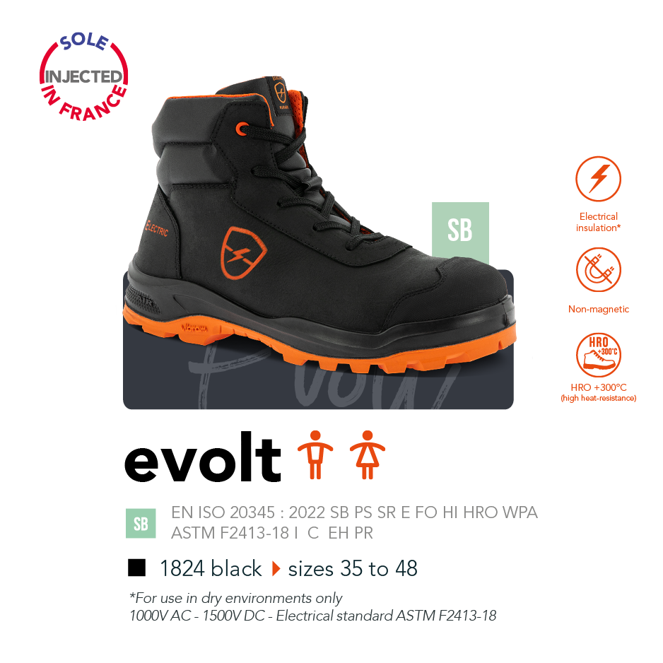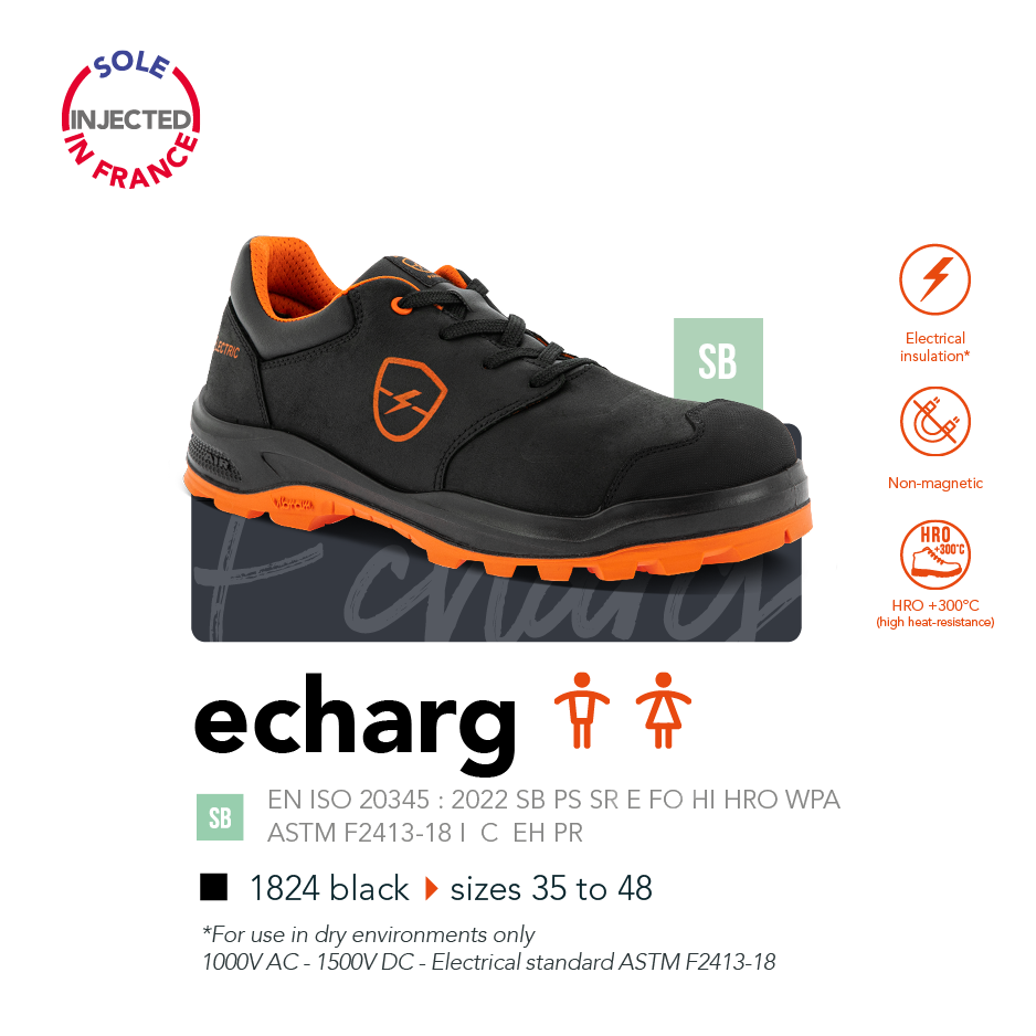 This range has been designed for workers responsible for repairing electrical vehicles, working on underground network detection sites or in electrical maintenance. It guarantees that the sole is insulated against the risk of electric shocks due to voltages of up to 1000 volts in alternating current (AC) and up to 1500 volts in direct current (DC), in a dry environment.