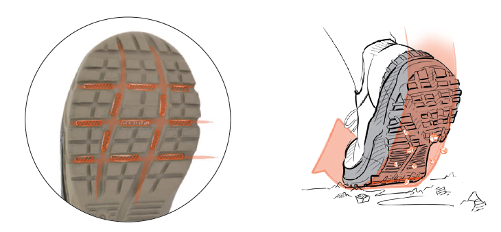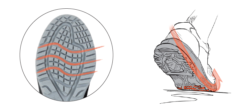 Découvrez aussi nos technologies de semelles exclusives, adaptées aux besoins spécifiques des métiers les plus exigeants. La technologie FLEX SYSTEM est adaptée aux métiers du BTP, et aux sols accidentés. Le dessin exclusif de la semelle, avec ses rainures, diminue les zones de contraintes au niveau de la semelle, et apporte ainsi flexibilité et confort lors de la démarche. Le déroulé du pied est accompagné, et les rainures horizontales et crantées, situées sous les métatarses, au niveau des plis du pied, facilitent l'évacuation de la terre pendant la propulsion. Retrouvez notre technologie FLEX SYSTEM sur tous nos modèles dotés de nos semelles NEBRASKA et NEVADA.