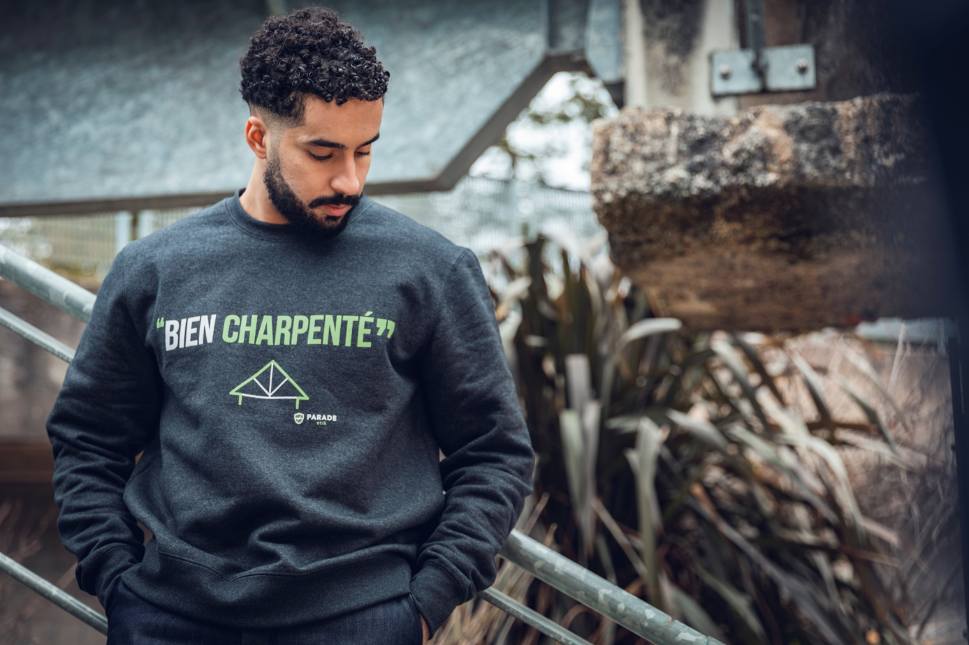 Parce que l’humour a aussi sa place sur les chantiers, Parade Protection a développé le sweat TSWEAT au message “bien charpenté”. Une coupe classique, col rond, base et bas de manches resserrés en bord-côtes, pour un look casual intemporel. Sa matière molletonnée est ultra-douce à l’intérieur, pour plus de chaleur et un meilleur confort. En outre, TSWEAT est constitué de matière 100% recyclées.