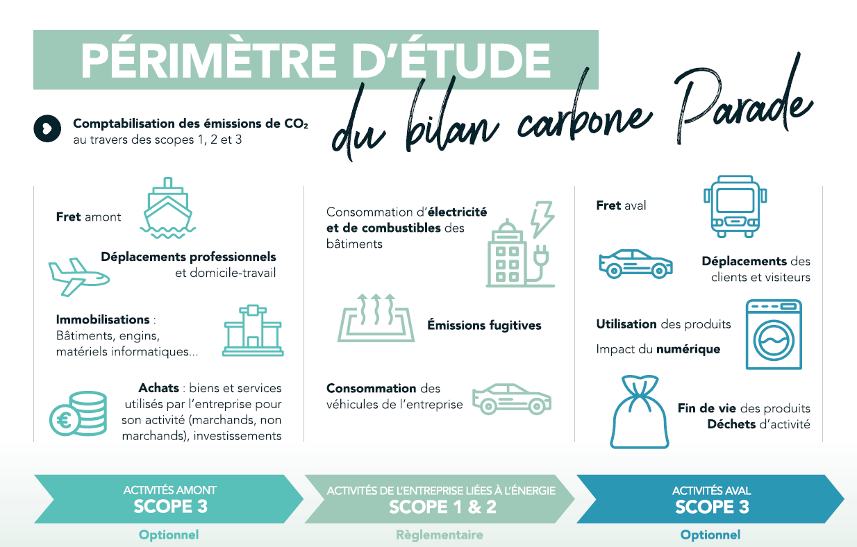 • Scope 3 : toutes les autres émissions indirectes intégrant les activités amont et aval (optionnel). Ce dernier représente 99% du bilan carbone Parade.