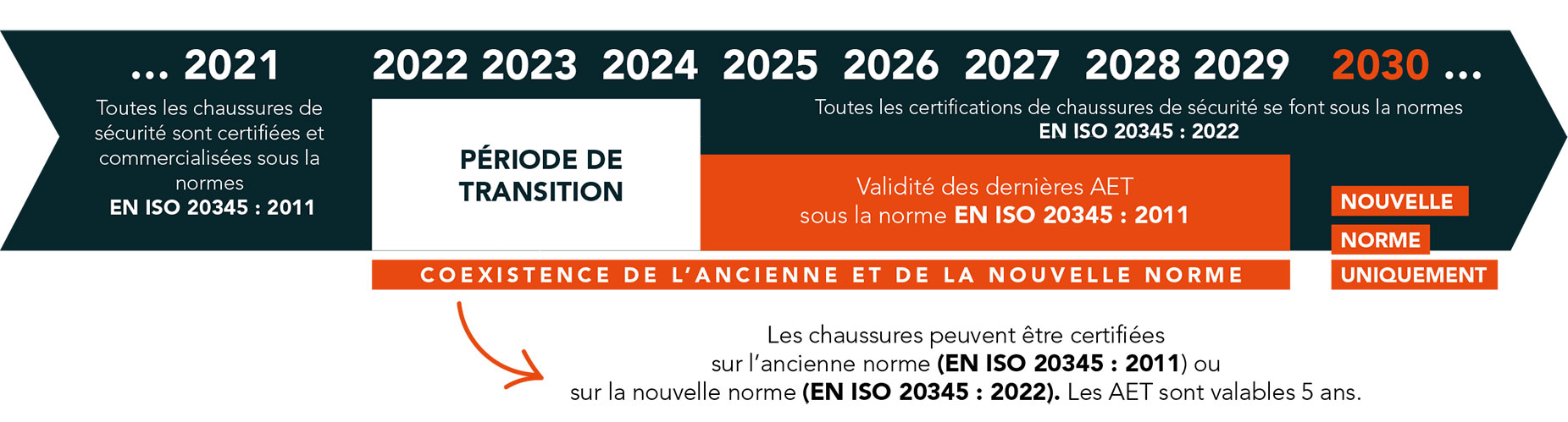 Depuis sa publication au journal officiel européen en mai 2023, la norme EN ISO 20345 : 2022 est harmonisée dans toute l’Union Européenne. Le calendrier prévoit une période de transition permettant aux fabricants de chaussures de sécurité de faire certifier leurs produits au choix selon la norme EN ISO 20345 : 2011 ou selon sa nouvelle version EN ISO 20345 : 2022. Cette période de transition s’étend jusqu’au 11 novembre 2024.