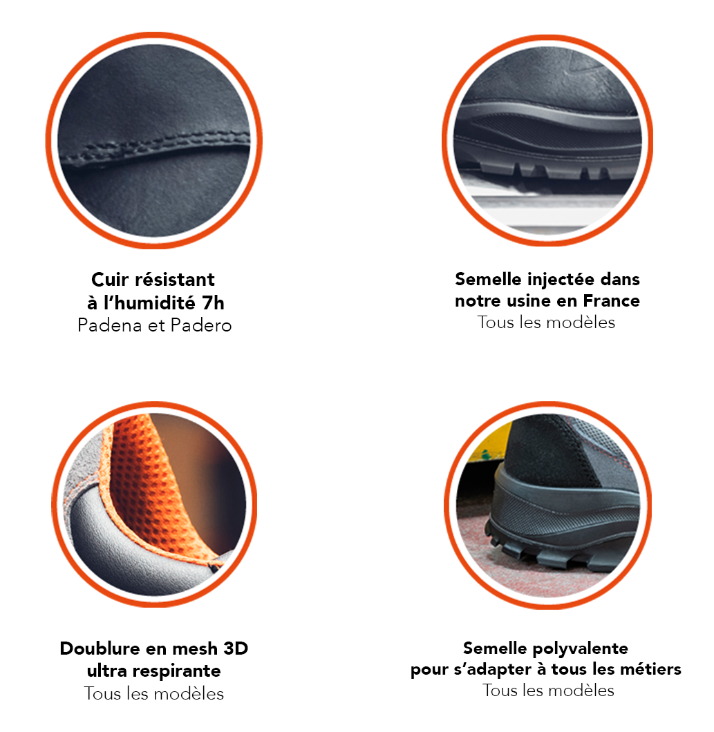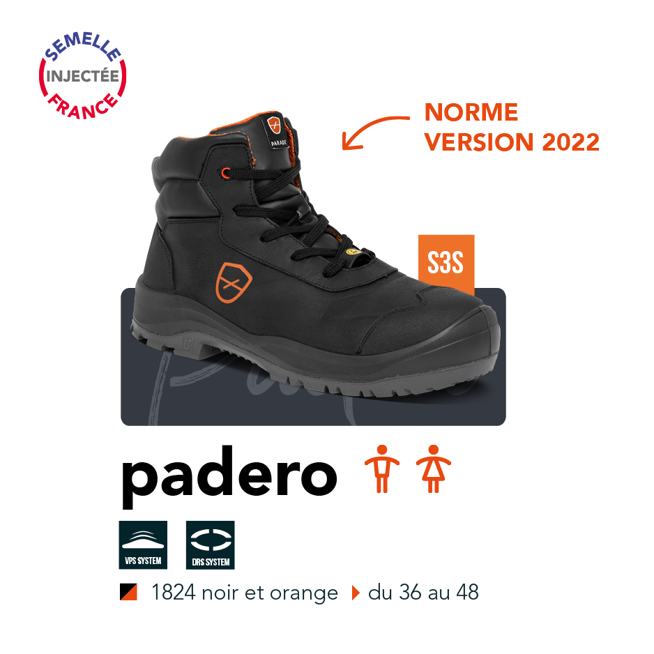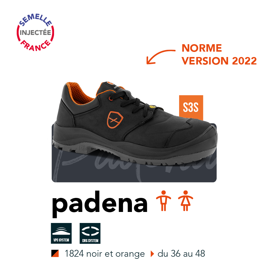 La gamme s’agrandit avec l’arrivée de deux nouveaux modèles cuir S3S : Padena & Padero. Adaptés pour le travail en extérieur, Padena et Padero se parent d’un CUIR PULL UP RÉSISTANT À L’HUMIDITÉ 7H et d’un talon décroché marqué LG, idéal pour affronter les terrains accidentés. Ils sont également normés ESD.