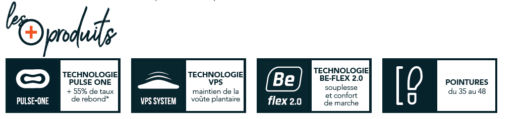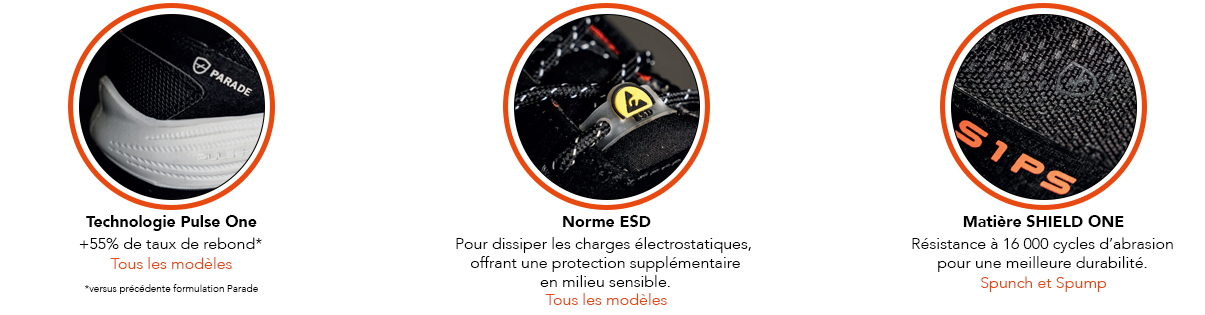 Notre gamme SPULSE est composée de 4 modèles S1PS et S3S dont la conception est centrée sur le bien-être des professionnels avec un objectif : améliorer leur endurance. Les résultats des tests d’activation musculaire montrent que notre gamme SPULSE réduit la fatigue sur les muscles propulseurs de la jambe, pour une meilleure endurance tout au long de la journée. La technologie exclusive Pulse-One offre un taux de rebond amélioré de +55% par rapport à notre précédente formulation Parade
