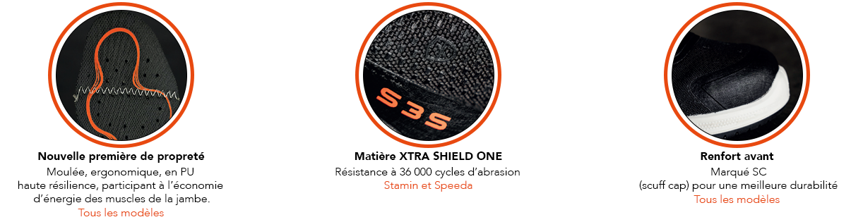 • Nos technologies de matière exclusives Shield One et Xtra Shield One pour une meilleure durabilité. Leur formulation en toile + PU garantit une résistance à 16 000 cycles d’abrasion sur nos modèles S1PS, et à 36 000 cycles d’abrasion sur nos modèles S3S.